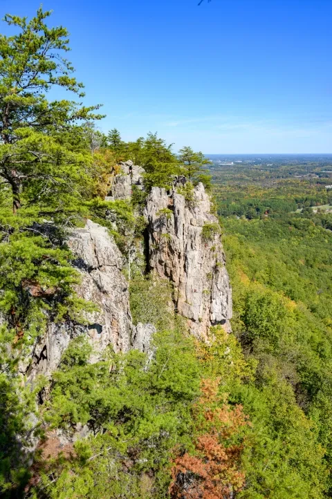 Two bold peaks — Crowders Mountain and The Pinnacle — rise above the Piedmont at Crowders Mountain State Park, delivering steep climbs, towering cliffs and long-range views on clear days. Pick from 11 trails that range from mellow lake loops to lung-burners, including the Ridgeline Trail that links into Kings Mountain sites across the state line. After your hike, fish at the 9-acre lake or reserve a backcountry campsite for a night under the stars. Rock climbing and bouldering are also available by permit in designated areas, with a visitor center that rounds out the experience with exhibits and ranger-led programs.