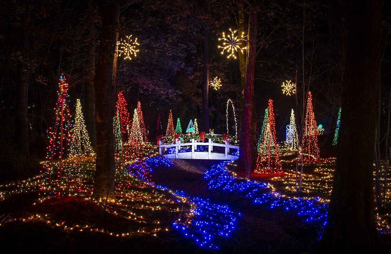 Christmas time is absolutely stunning at Mike’s Farm with lights, lights and more lights. Lights adorn the farm entry way, barns, restaurant and gift shop – they even light up owner Mike Lowe’s family tractor. The 30-minute hayride begins its nostalgic journey entering a magical archway of lights with whimsical scenes of farm life, present and past. Covered bridges and creek beds draws you in with their lighted beauty.