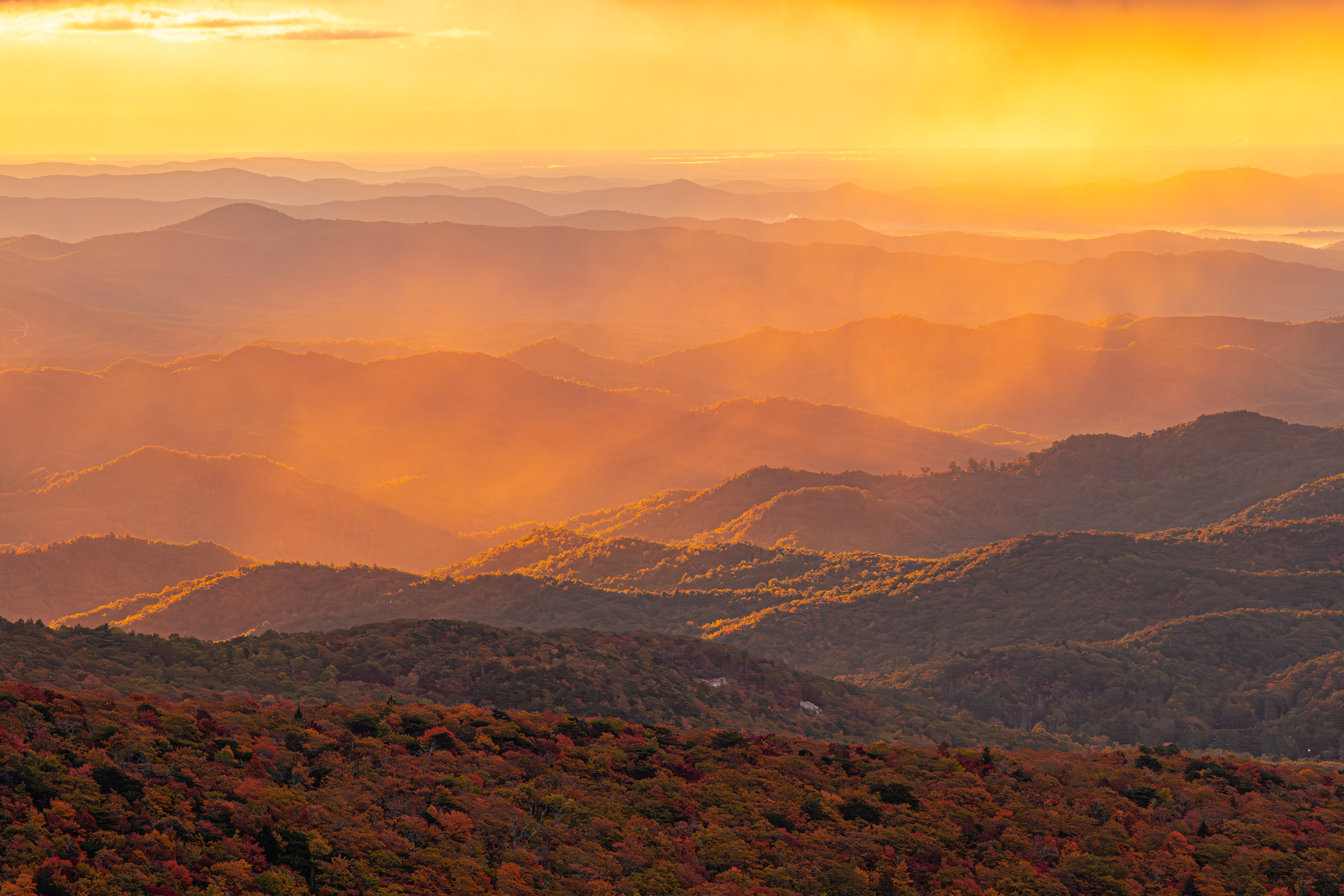 Follow the falling leaves from high peaks to valley floors as color sweeps across the region. Pounding Mill Overlook just outside Brevard, in Pisgah National Forest, allows for stunning sunrise views of iconic mountain scenes including Mt. Pisgah, Black Mountain, Frying Pan Gap and Looking Glass Rock.