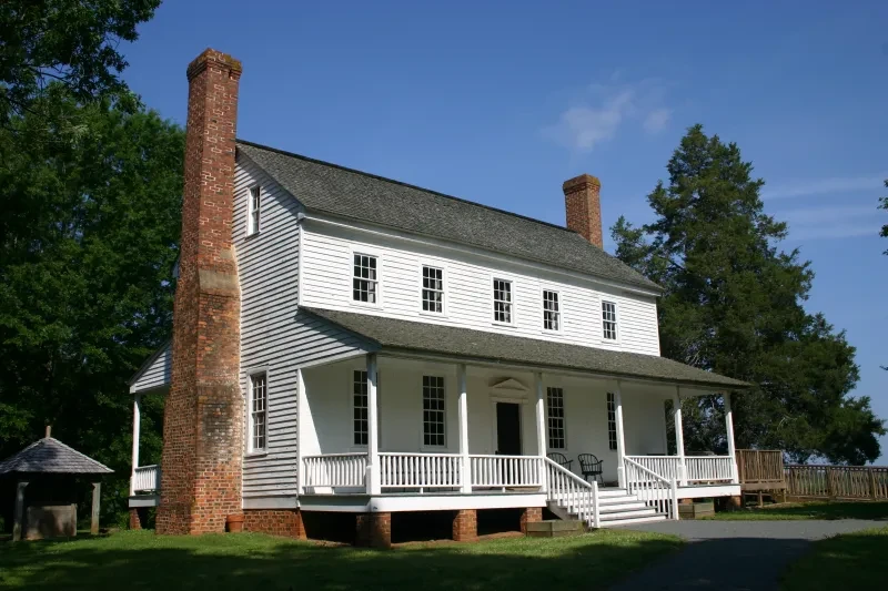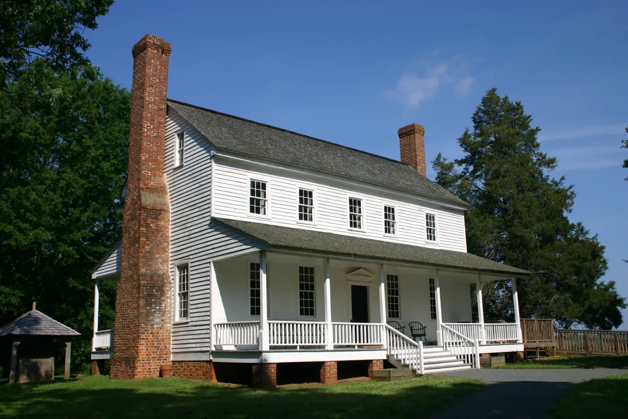 As the Deep River wanders through North Carolina's Piedmont plateau near Sanford and curves in a horseshoe bend, there stands on a hilltop one of the first big houses of upland North Carolina frontier country, the House in the Horseshoe. This house is a rare surviving example of early Georgian-style frontier architecture in upland North Carolina. Built around 1772, its symmetry and simplicity stand in stark contrast to the violent Revolutionary War skirmish it endured — bullet holes from that July 29, 1781 clash between Patriot colonel Philip Alston and attacking Loyalist forces still scar its walls. During the skirmish, the Tories attempted to light the house on fire by rolling against it a cart filled with burning straw. After several casualties on both sides, Alston surrendered. In spring, the surrounding grounds come to life with blooming wildflowers, bringing color and calm to the historic site.