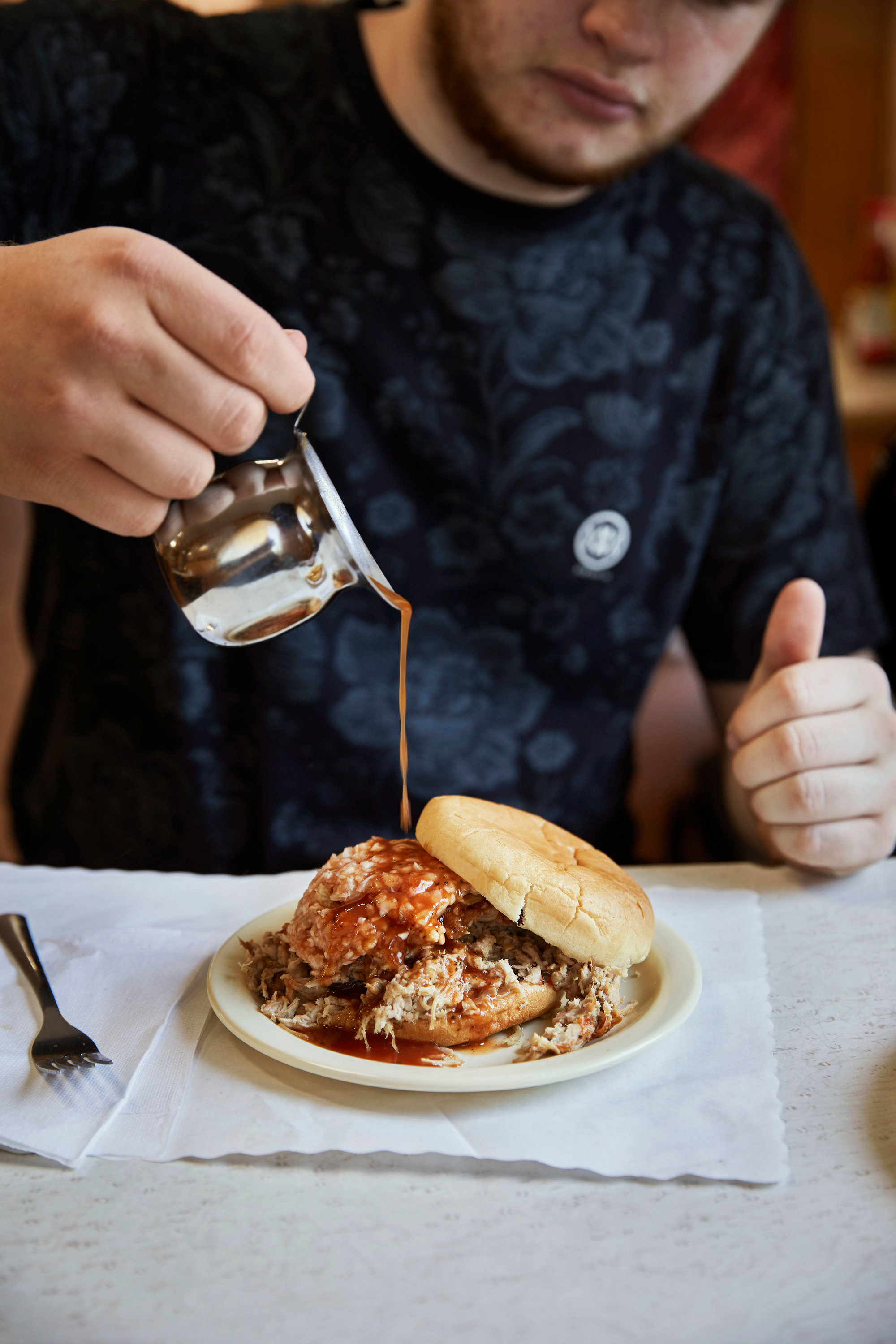 Lexington is best known for hickory-smoked pit-cooked barbecued pig shoulders and has been since the early 1900s. The pork is offered up finely or coarsely chopped or as slices — but never “pulled.” It’s typically served with “red” or “white” coleslaw and often as part of a sandwich tray or plate with hush puppies and more on the side. The famed Lexington-style sauce is generally made of vinegar, ketchup, sugar, salt and pepper.