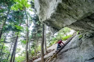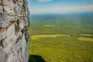 Ditch the rise-and-grind routine for a rise-and-climb instead. A short drive from Winston-Salem, the Sauratown Mountains’ gnarled gray peaks tower over the Piedmont flatlands, beckoning you to make like Spider-Man on the quartzite. The 300-foot cliff at Moore’s Wall is world-class rock with sheer vertical lines, bucketlike handholds and big route variety. If you’re a climbing newbie, call the experts at Blue Ridge Mountain Guides to take you up.