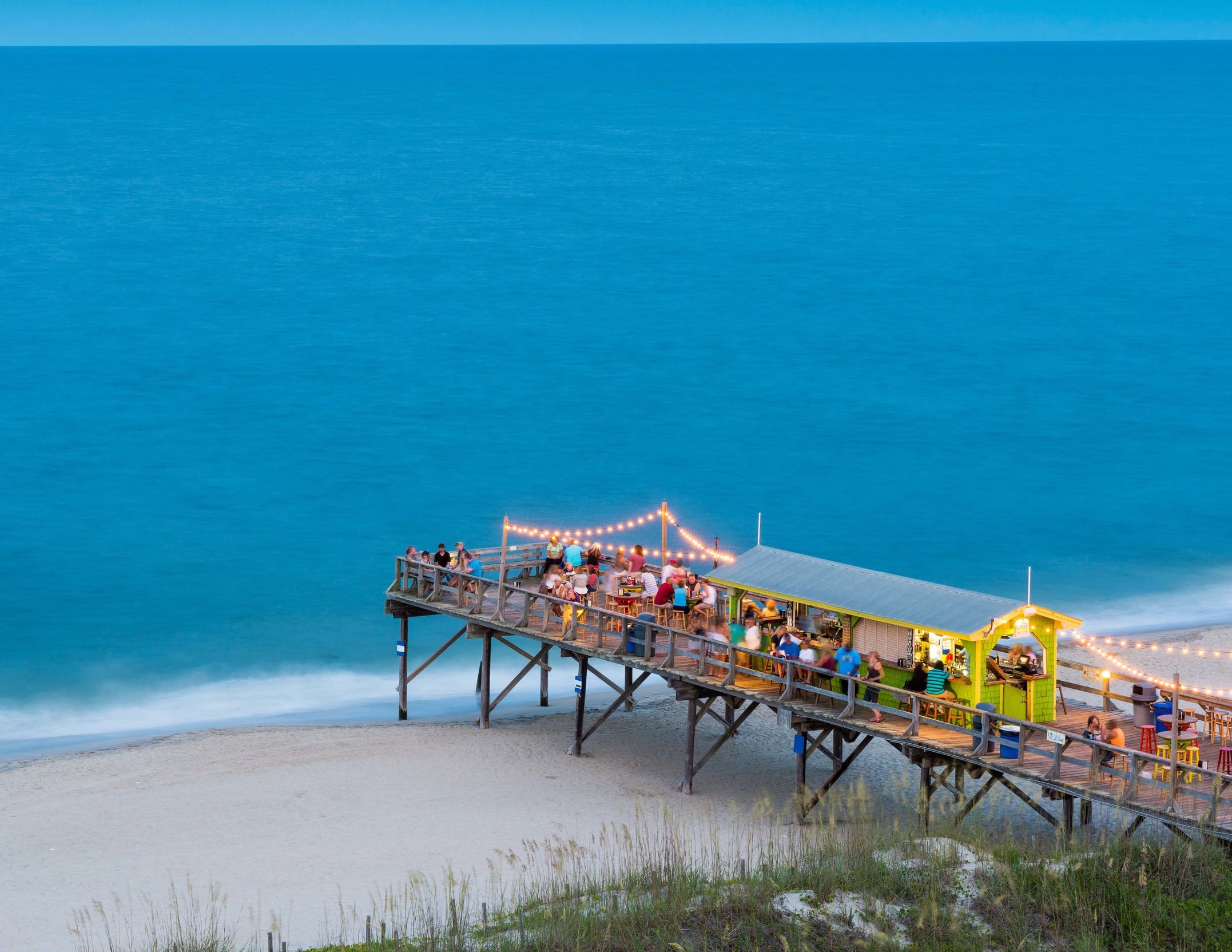Leave plenty of time for playing on the beach and savoring the views. Rent a surrey bike that accommodates up to eight people, walk the 700-foot scenic pier, and enjoy your picturesque beach cottage or oceanfront condo. In nearby Kure Beach, the North Carolina Aquarium at Fort Fisher also deserves a visit for its interactive experiences and free daily programs that include feedings, diver talks, and meet-and-greets with reptiles.