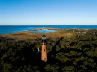 Currituck Beach Light Station on the northern Outer Banks has protected North Carolina's shores since 1875. Made of roughly 1 million red bricks, this active lighthouse’s exterior differs from a more common black-and-white color scheme to the south.