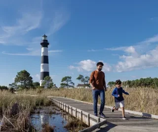 The Cape Lookout Lighthouse is most recognized for its large black-and-white diamond design. Originally rejected by 19th-century mariners, the structure was later used as the model for future Outer Banks lighthouses. It's the southernmost lighthouse on the Crystal Coast along the Outer Banks and is only accessible by private boat or ferry. Though the lighthouse is undergoing extensive renovations through 2025 and is currently closed to climbers, you can still admire it from the base.