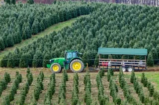 Group of people on hayride at U-pick Christmas tree farm during daytime.