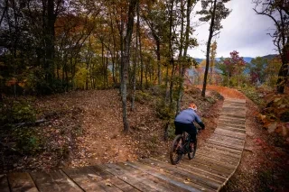In the heart of the Qualla Boundary, the 11-mile Fire Mountain Trails find mountain bikers riding high on a mountain overlooking Cherokee. A mix of single-track trails and wide, flow-friendly sections give all riders a challenge, and when it’s time to descend, experienced downhill riders should feel free to find another gear. Rock gardens, tables and blind jumps make the Kessel Run a good test, and runs such as Spearfinger, Lazy Elk and Waya introduce sharply banked turns, dips, jumps and other technical elements that veteran riders crave. For beginners, Tinker’s Dream and Kate’s Wave can help build confidence on the trails.