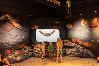 Sea turtles are highly visible at all three North Carolina Aquariums, which are also involved in rescue, rehabilitation and release. The Aquarium on Roanoke Island, located on the Outer Banks, features a Sea Turtle Rescue exhibit. Visitors to the Aquarium at Pine Knoll Shores on the Crystal Coast can follow the journey of loggerhead sea turtles — and even speak with one — in the Loggerhead Odyssey exhibit. In the Wilmington area, The Aquarium at Fort Fisher features turtle exhibits and Turtle Talks at the adjacent Fort Fisher State Recreational Area.