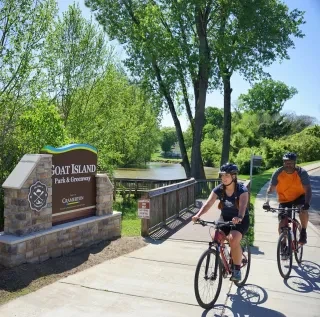 Spend an unhurried afternoon in Cramerton, where small-town charm meets riverfront beauty. Pick up lunch from a local spot like Floyd & Blackies, rock in the rocking chairs along the river, cast a line in the South Fork River, then cross the bridge to Goat Island for fun in the park with disc golf, a playground, corn hole and ping pong. No rush. No agenda. Just joy.