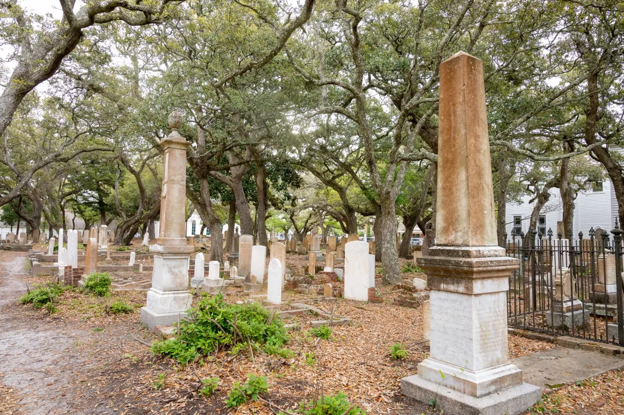 Tucked into the 400 block of Ann Street in Beaufort — North Carolina's third-oldest town — sits one of the area's oldest cemeteries, the Old Burying Ground. Established in the early 1700s, the cemetery has been full for nearly 200 years and has remained a popular tour spot due to its unusual inhabitants. Here lies a child who was buried in a keg of rum after she died at sea, as her father promised he would bring her home and rum was the only way to preserve her; a British soldier who was buried standing up; and the common grave of the crew of Crissie Wright, who died when their schooner went aground at Shackleford Banks during a storm in January 1886. On the National Register of Historic Places, the Old Burying Ground tells many stories of colonial life in Beaufort. Guided tours are available throughout the summer with docents from the Beaufort Historic Site and year-round on the Beaufort Ghost Walk.
