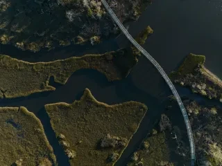 Aerial of two people walking on bridge over marsh in coastal forest